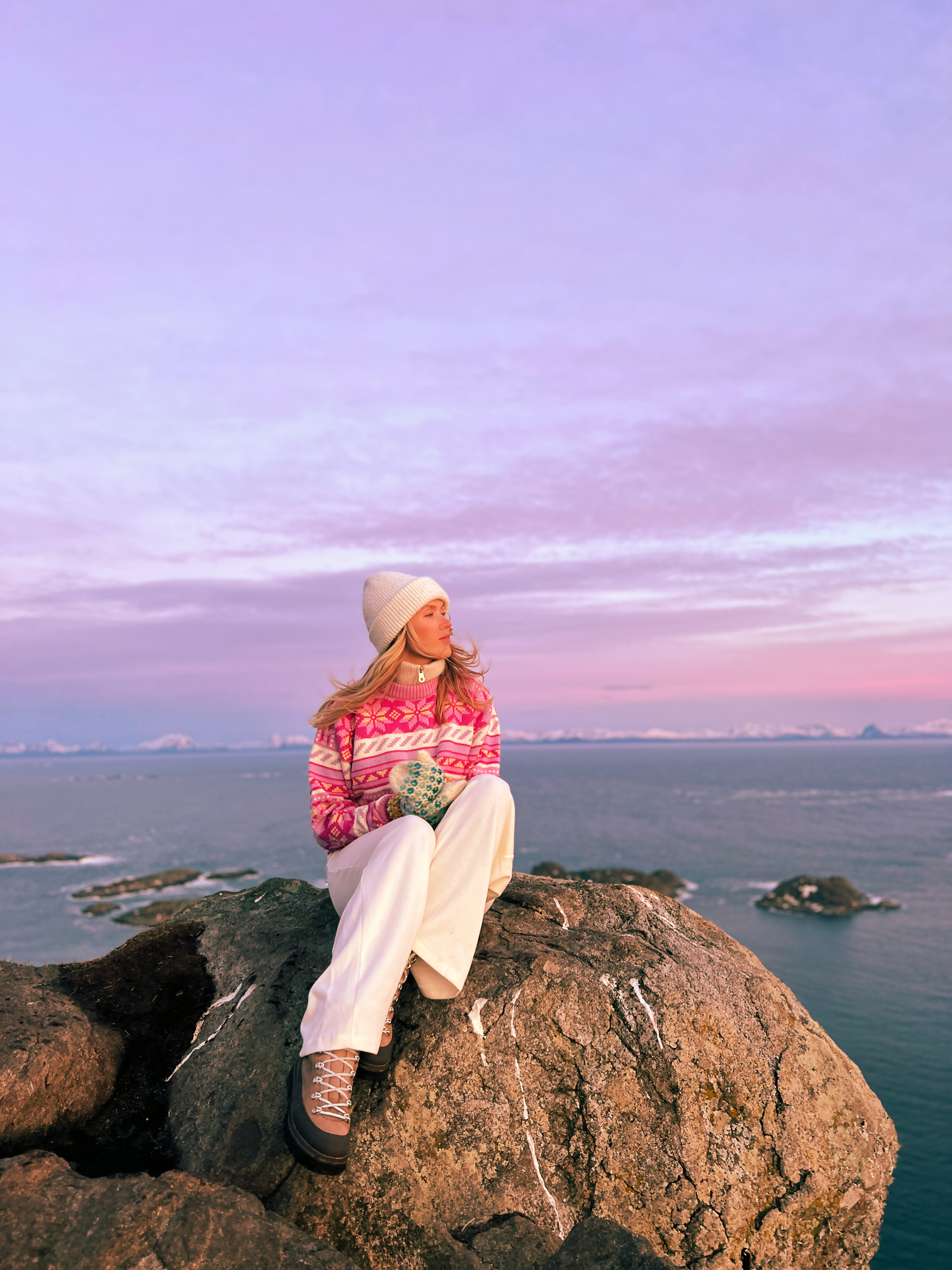 Interessen for strikkegensere oppsto da Ingrid flyttet til Lofoten i 2017. “Jeg merket fort at både stilen og behovet for ull og strikk her i nord var større enn i Oslo. I Lofoten begynte jeg å kle meg mer praktisk, og etterhvert som tiden gikk begynte jeg å gå med strikkegensere daglig”, forteller den fargeglade jenta.