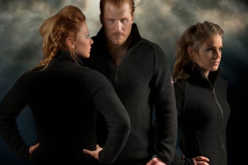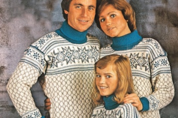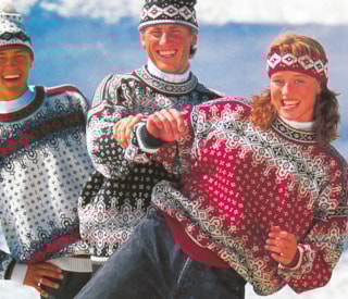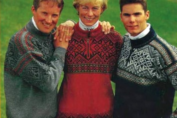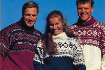 Bildet viser de norske langrennsutøverne Vegard Ulvang, Marit Wold og Thomas Alsgaard i den offisielle VM-genseren.