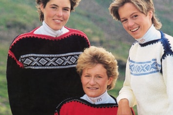 Bildet viser de norske langrennsutøverne Britt Pettersen, Berit Aunli og Grete Ingeborg Nykkelmo i den offisielle VM-genseren.