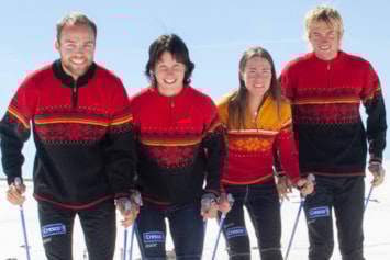 Bildet viser norske alpinister i den offisielle genseren til VM i alpint.