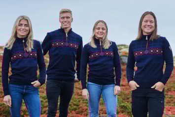 Bildet: Martin Johnsrud Sundby, Marit Bjørgen, Heidi Weng og Johannes Høsflot Klæbo i den offisielle OL-genseren.